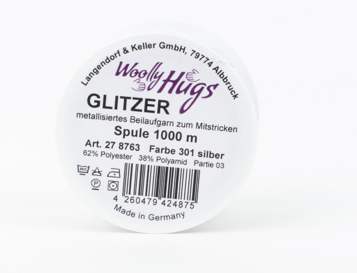 Herstellerinformationen "Woolly Hugs Glitzer, 62% Polyester, 38% Polyamid, Fb. 301 Silber"