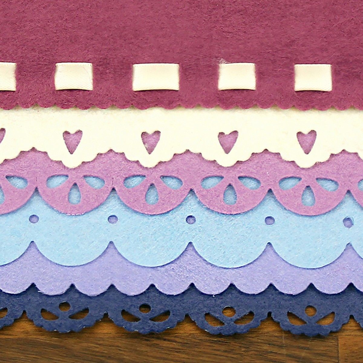 Part of the “Tammy Tutterow Heartfelt Stitches Collection. Cut beautiful, intricate edges with the Lovely Edges Fab Die Set. Our dies cut beautifully through all kinds of materials, especially wool and cork. And because you can place the dies anywhere on the fabric, none of your precious material is wasted!