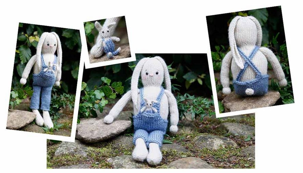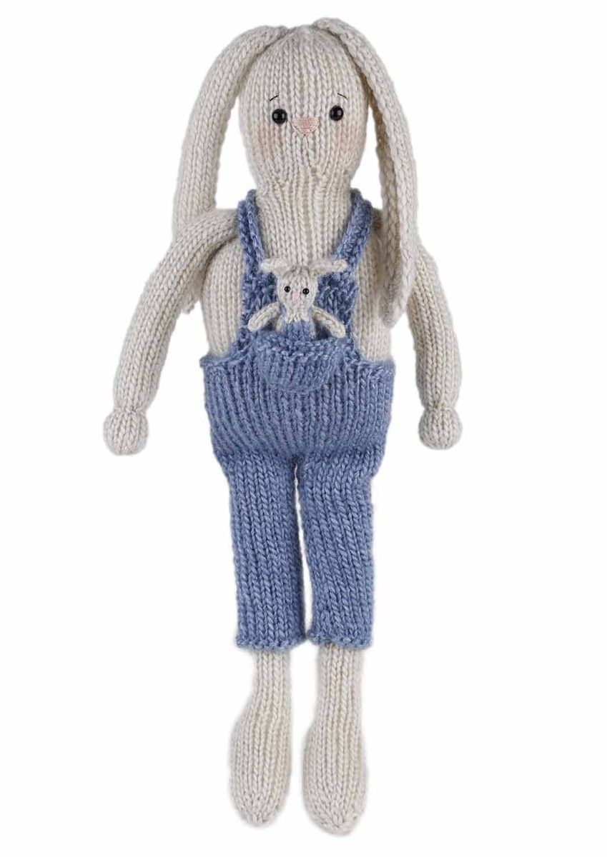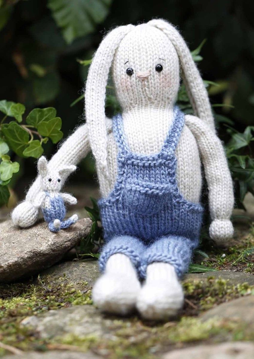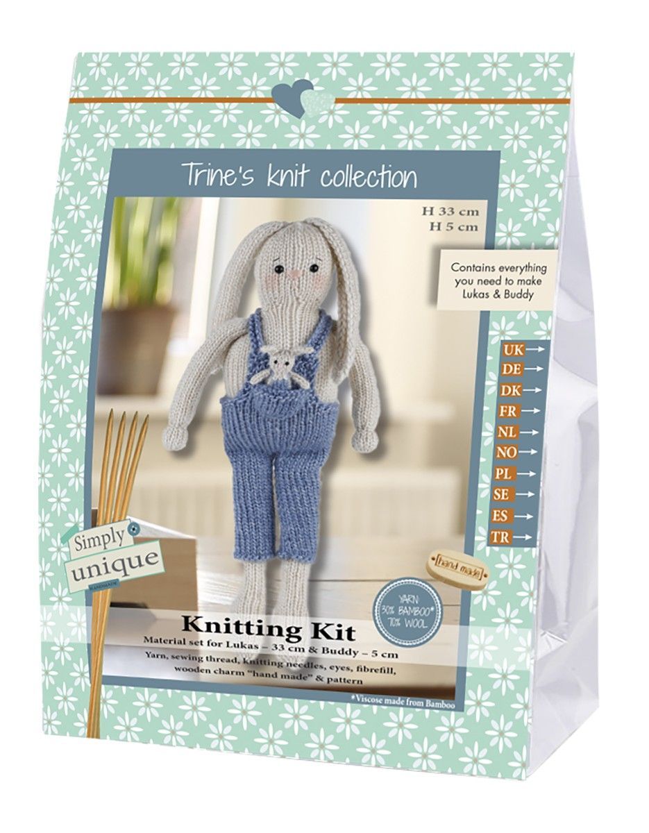 The Rabbits, Lukas and Buddy contains yarn, sewing thread, knitting needles, eyes, fibrefill, buttons, pipe cleaners, plastic granules, wooden charm "Hand made" and pattern.