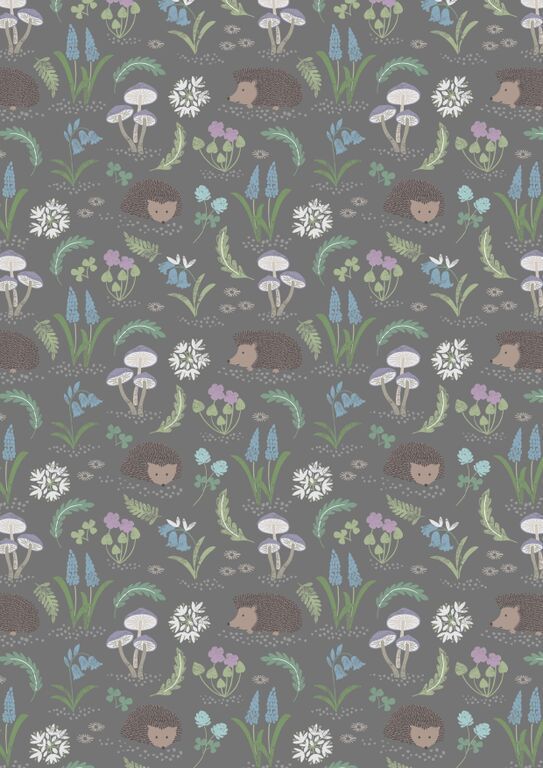 Lewis & Irene Bluebell Wood Hedgehog On Grey 10 m bolt, 112 cm wide, 100% Cotton