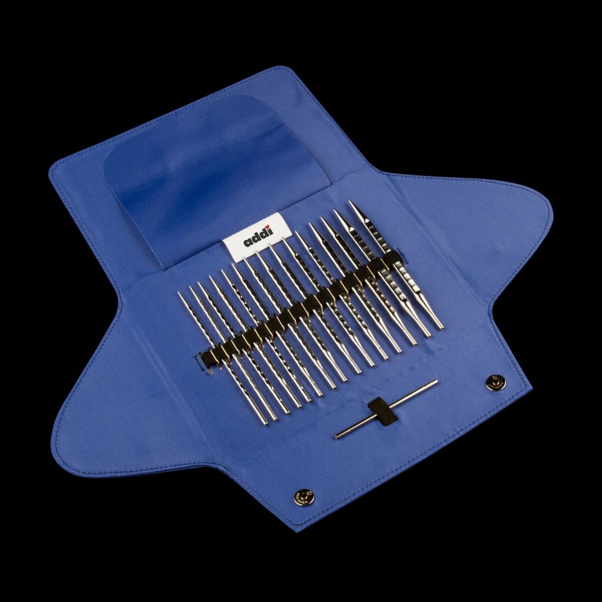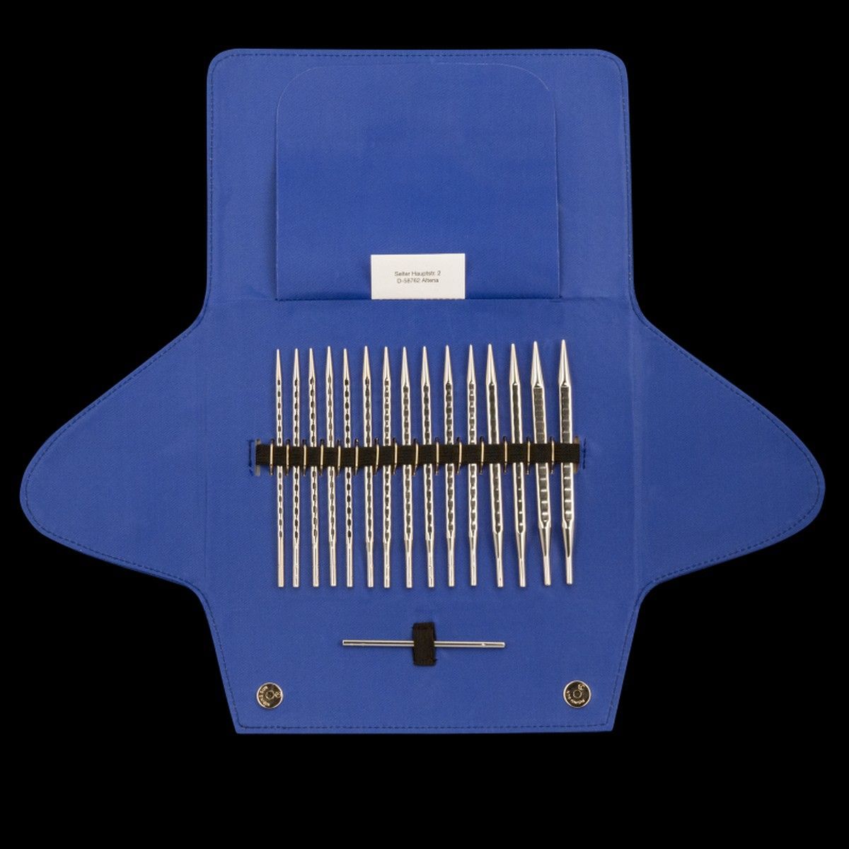 The addiClick LACE LONG case in a blue textile structure contains 8 long pairs of needles (3.5 - 8 mm) as well as 3 red addiSOS cords (60 cm, 80 cm and 100 cm), 1 connector, 1 gold pin, 1 addiGrip
